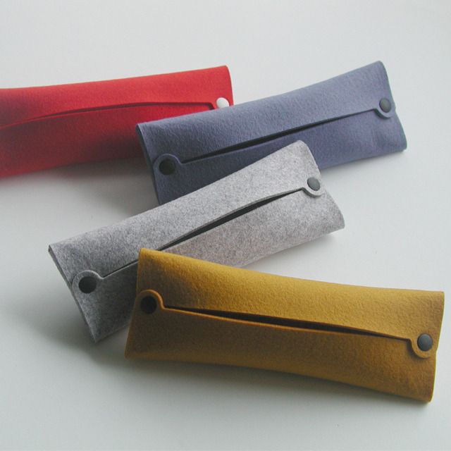 The felt pen case in ochre features a comfortable volume created by fastening a single piece of felt with a snap button and a slim shape that fits the hand.