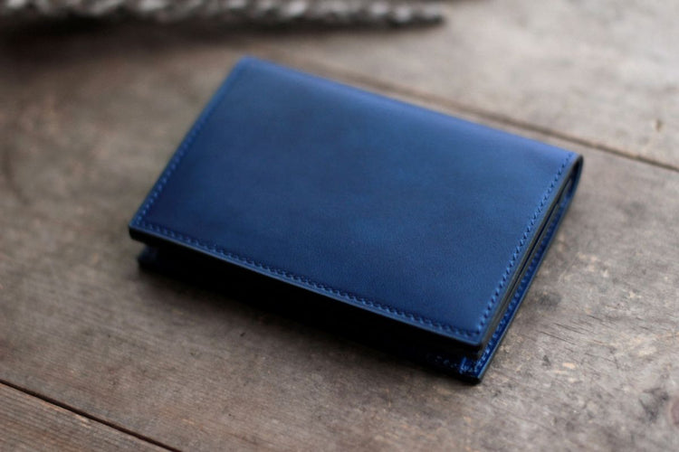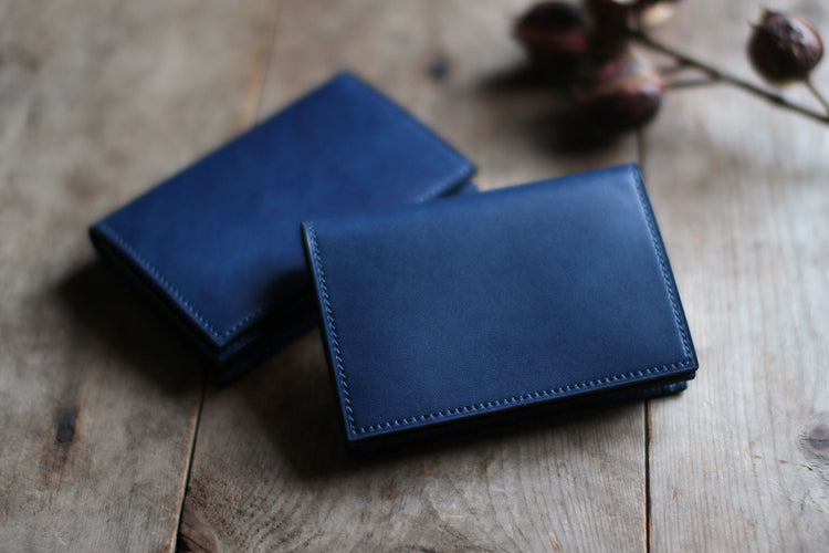 This business card case uses 1.7 times as much leather as usual, and everything from the part that cannot be seen from the outside to the thick part called "gusset" is made by pasting two pieces of indigo-dyed leather together.