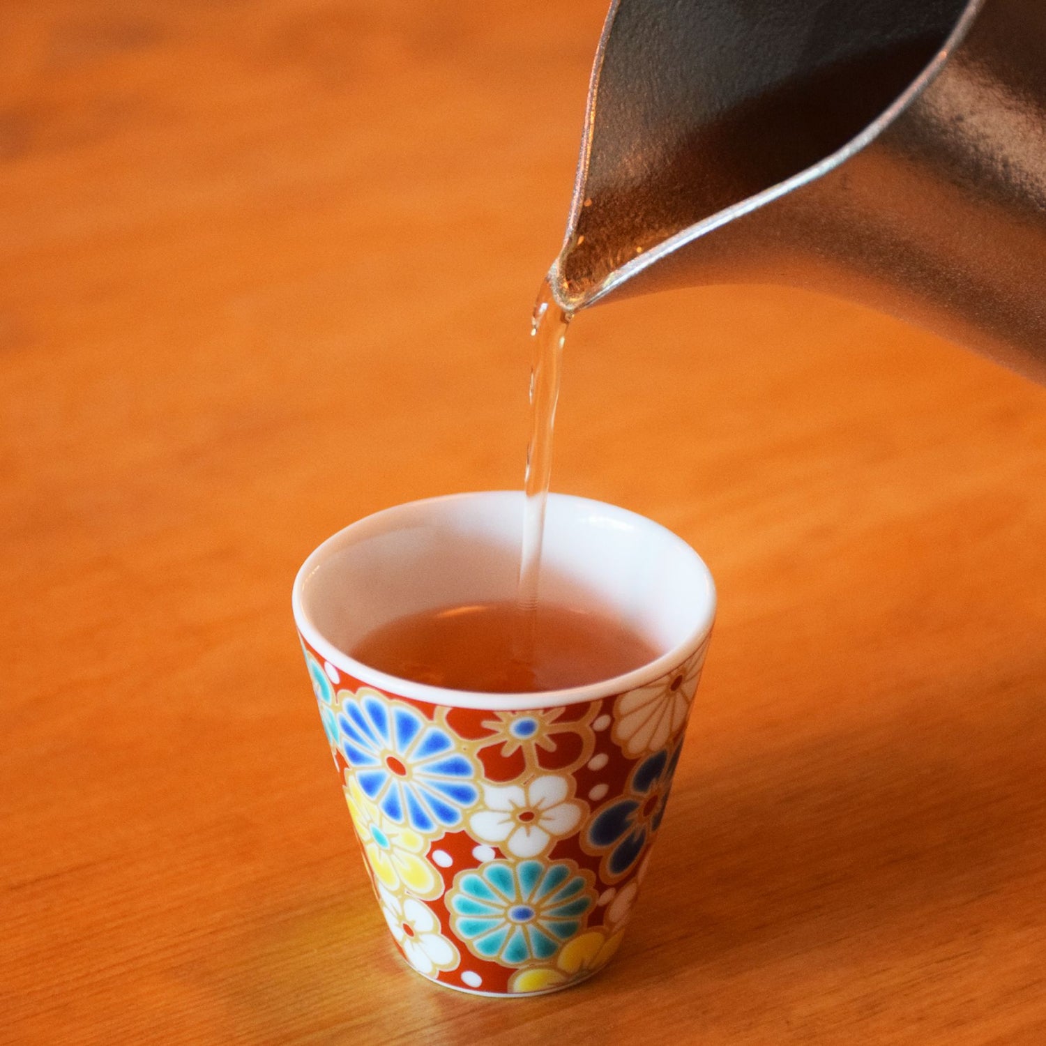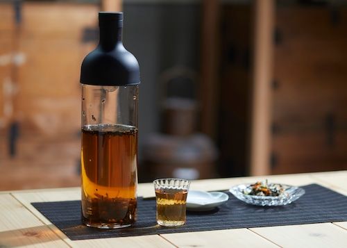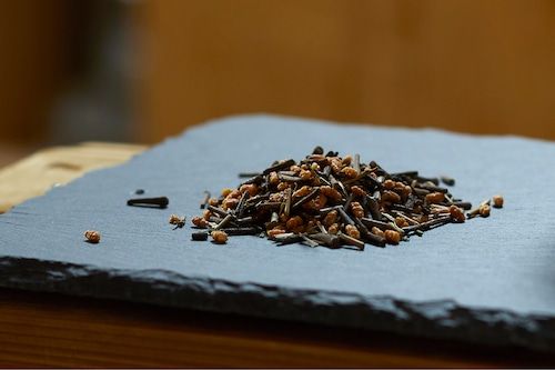 The base is made from genmaicha (brown rice tea) and stick hojicha, which is made from low-caffeine stems rather than leaves, and has about 60% less caffeine than ordinary green tea or hojicha.