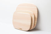 "The direction of use is necessary for the cutting board, and there is a hard impression though directionality comes out if it is square. With a round board, there is no directionality. That's why I made [a soft square] by combining a round and a square. The wood edge is slightly rounded so that when it stands on a flat surface, it will touch the flat surface at a point."