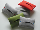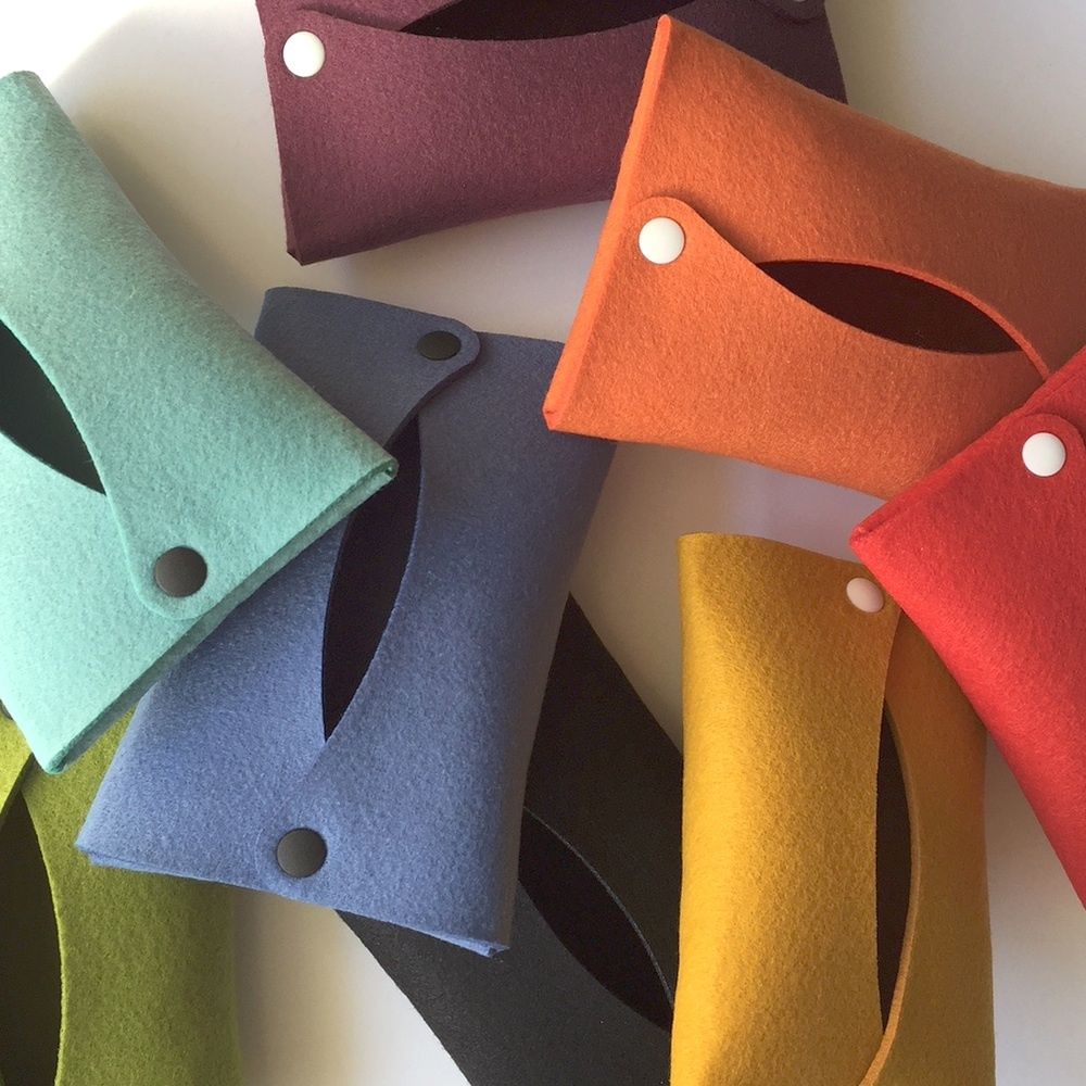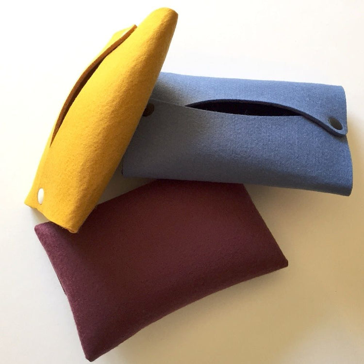 The pocket tissue case "Mustard" is made of a sheet of felt, folded and fastened with a snap button to create a shape made of felt. It has a comfortable volume that feels as if it swells up in your hand. Washable felt is used to make it easy to set in and remove tissues and to keep it clean. The pocket tissue case is a fun and stylish piece of artwork for everyday use.