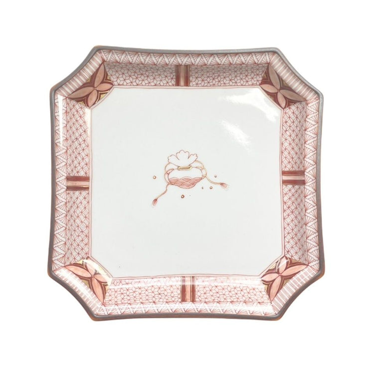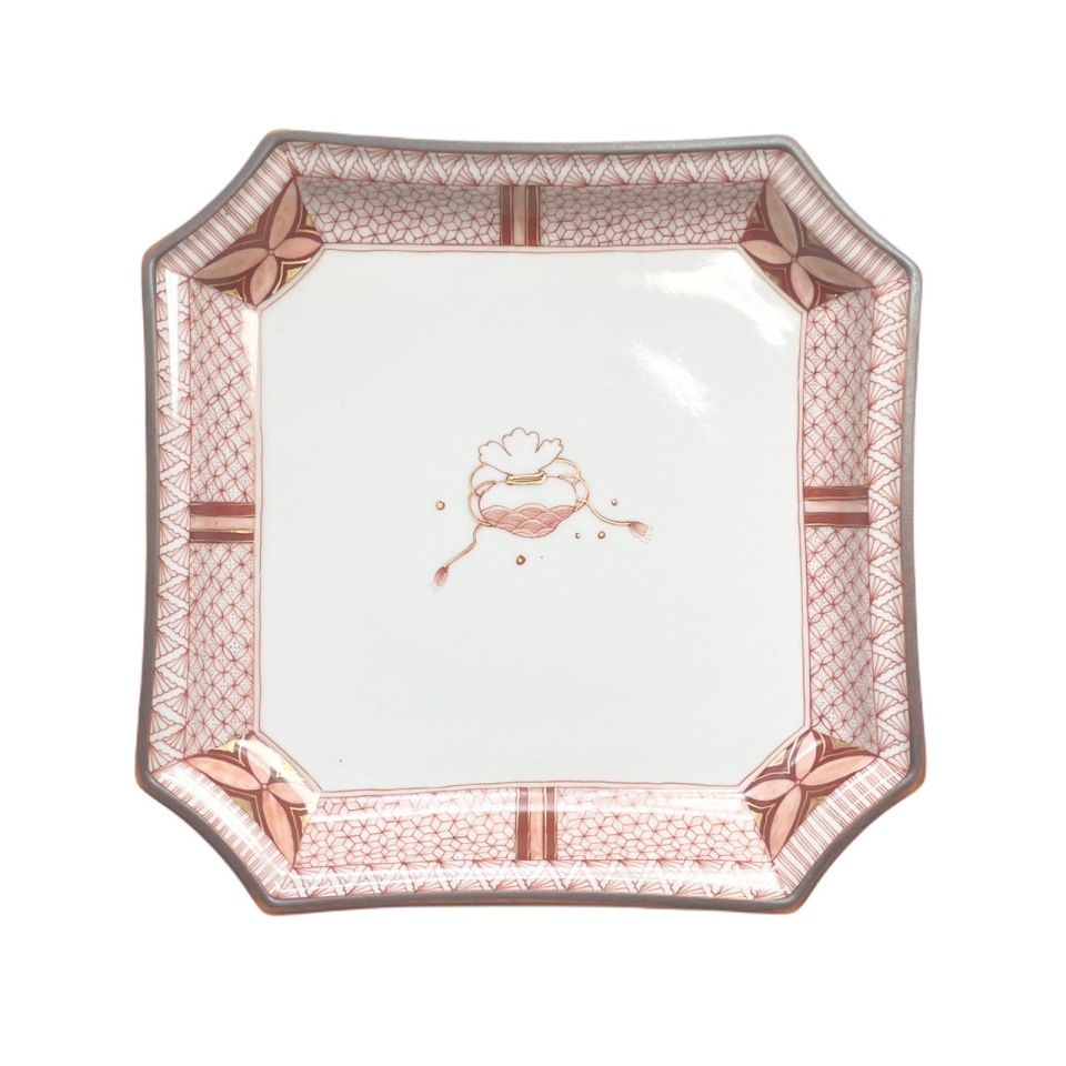 [Reiko Fukushima] Red enamel and fine-decorated cloth with a kinchaku pattern, 6"-sized, corner-cut square dish