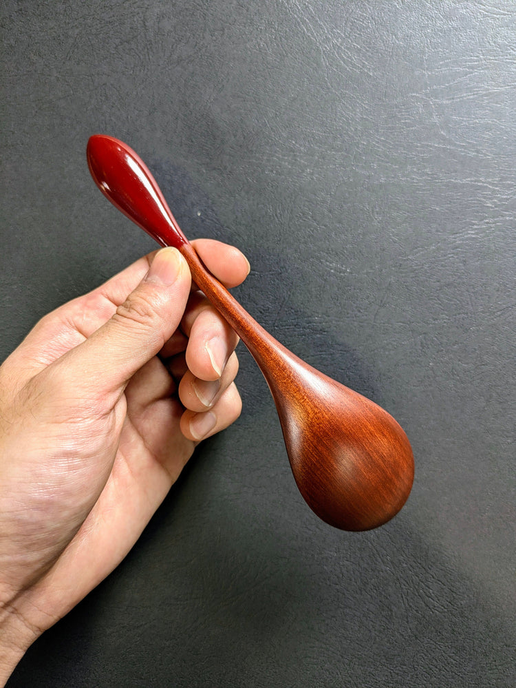 This wooden spoon is finished in red lacquer.