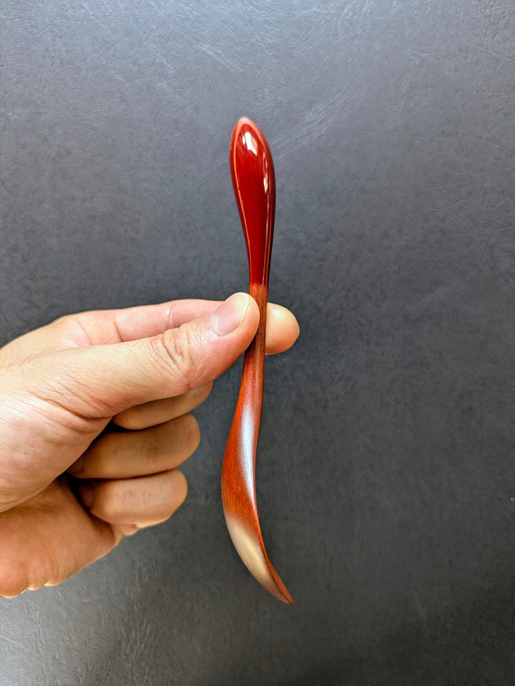 This wooden spoon is finished in red lacquer.