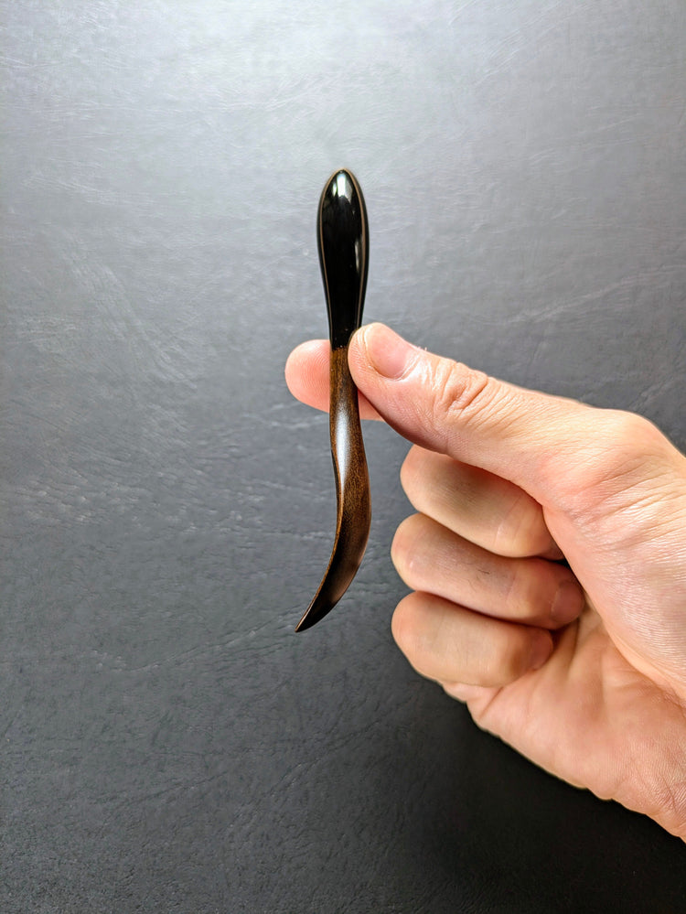 This wooden spoon is finished in black lacquer.