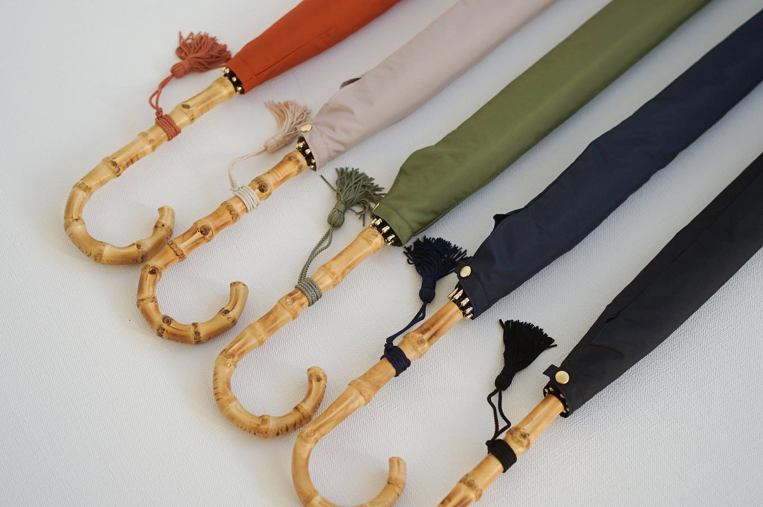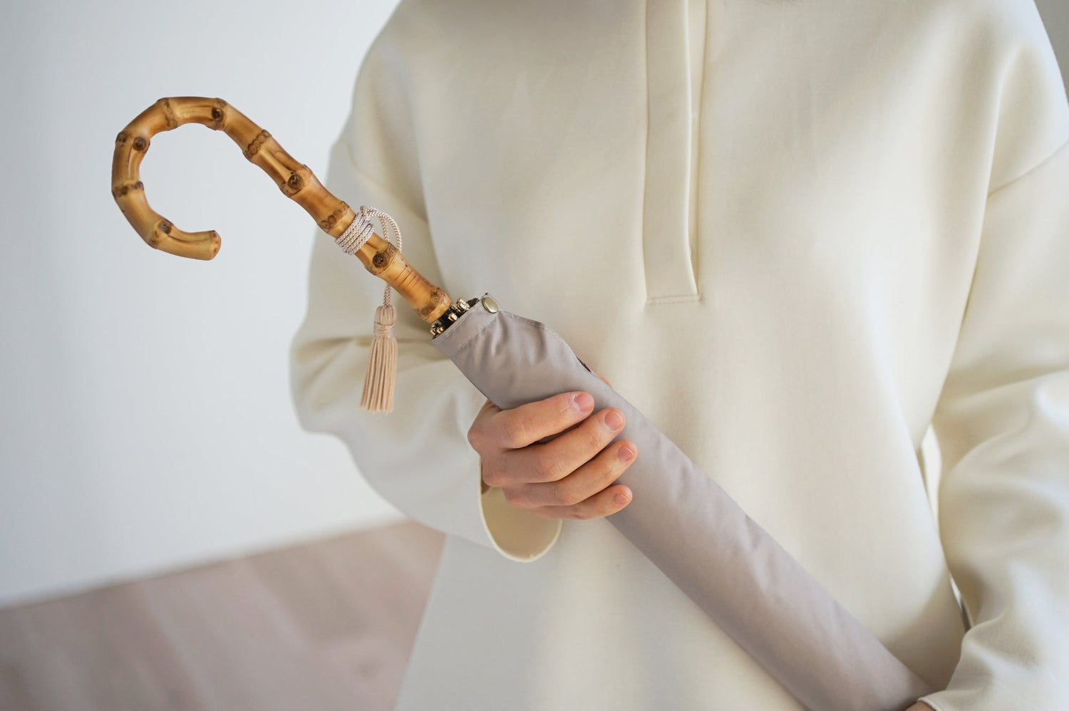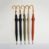 A symbiotic fabric umbrella bag is included for carrying and storage. The colored tassel adds a playful touch to this simple yet functional and stylish umbrella.