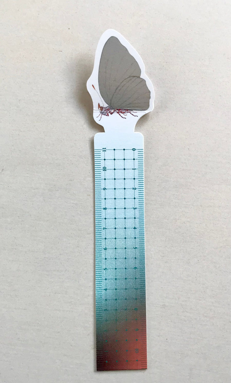 The wing veins of the wings, the butterfly's body, and the ruler are three-dimensionally raised and printed.