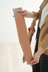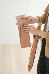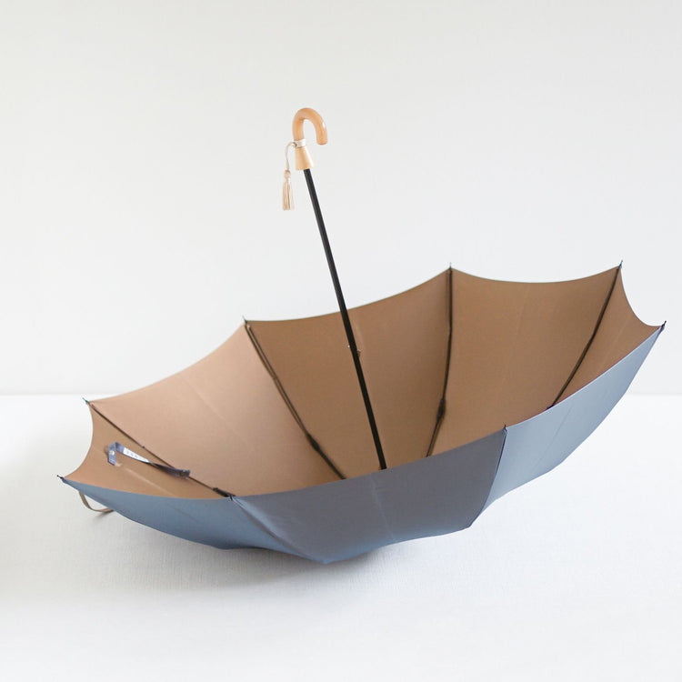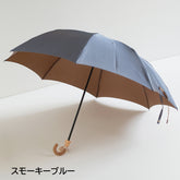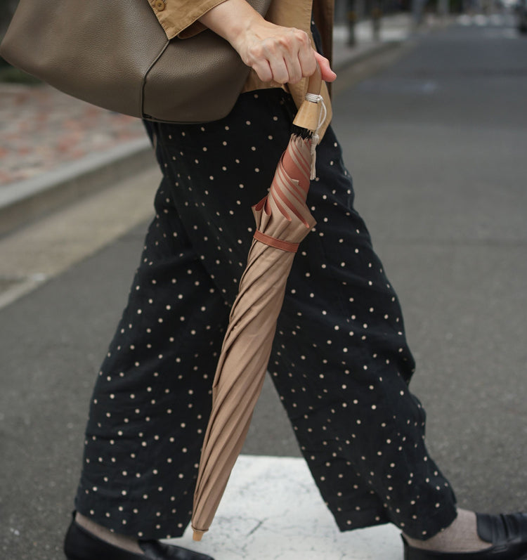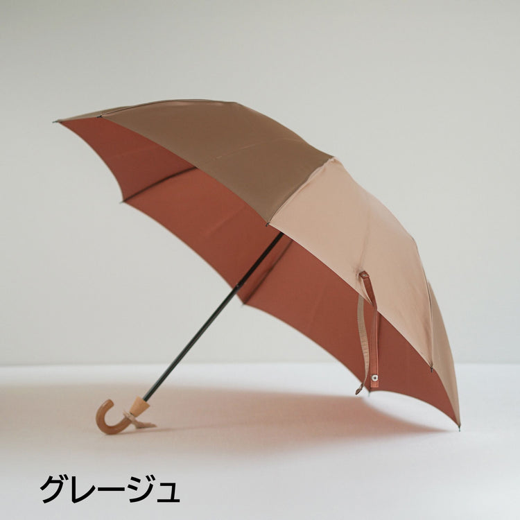 This is a folding umbrella for both rain and shine, using Koshuori fabric woven in two yarn-dyed colors so that the front and back sides are different colors. The new standard series "Toe Pray" incorporates nuanced colors and combines a color variation that is easy to match with any season's fashion with the luxurious feel of Koshu-ori fabric. The folding umbrella can be used like a long umbrella by attaching a name band to the front of the umbrella as well. The umbrella bag with 2-way specifications, which can be lengthened by unbuttoning, is also attractive and can be used functionally even after use in the rain.