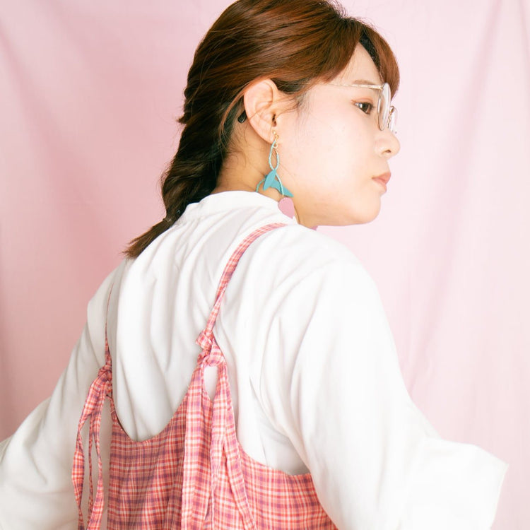 One earring has a leaf motif on the catch (in the case of clip-on earrings, the ear metal fittings), and when viewed from the front, they overlap to form a layer, which gives the earrings an even prettier look with their depth.
