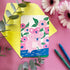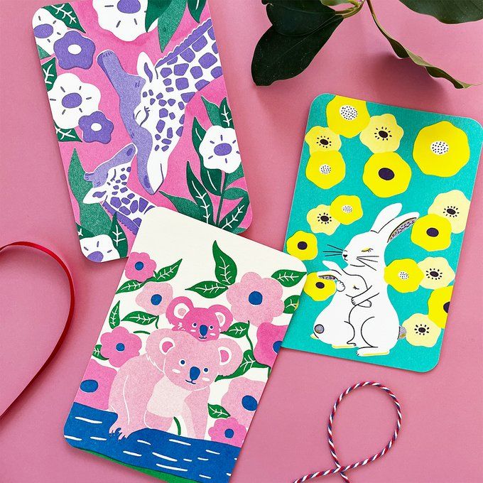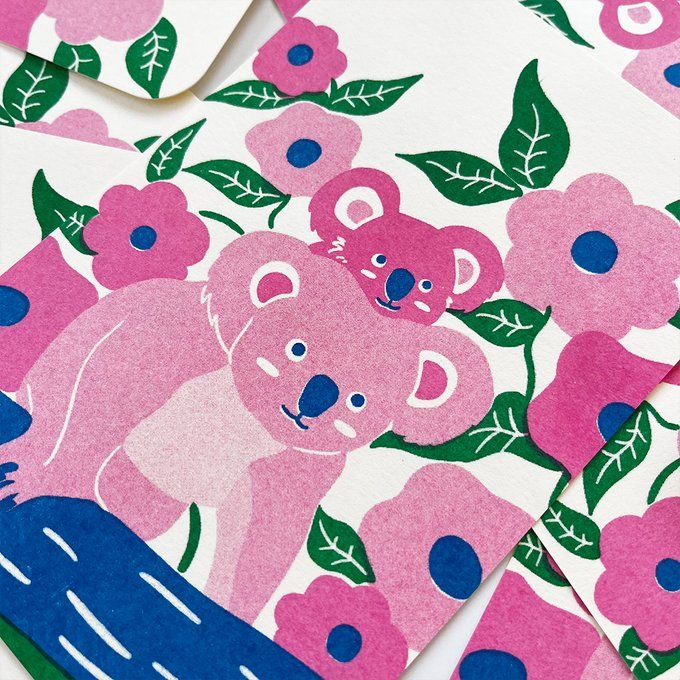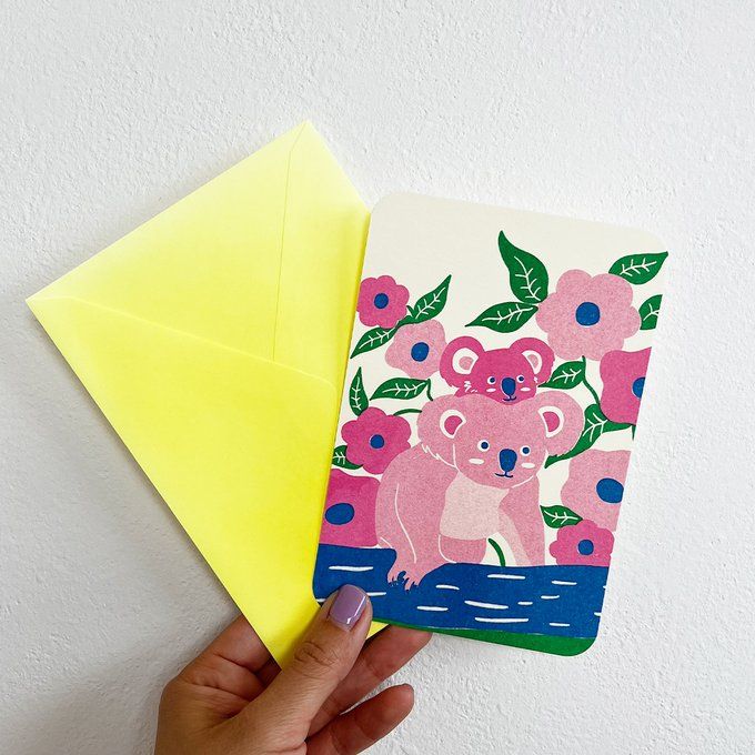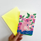 This postcard-sized card features an original illustration of a koala and its parents taking a friendly stroll through a tunnel of flowers.