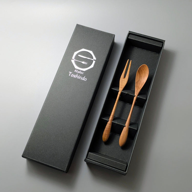 This cherry wood cutlery set is finished in natural colors with water-repellent paint.