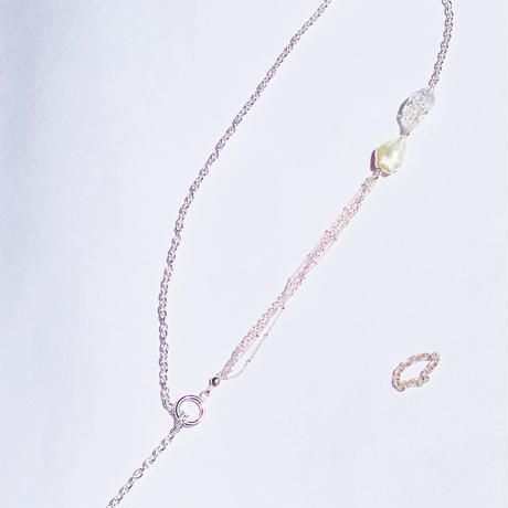 This necklace is rich in design, mixing a slightly thicker chain with multiple layers of slender chains, and is decorated with a large freshwater pearl and a Herkimer diamond.