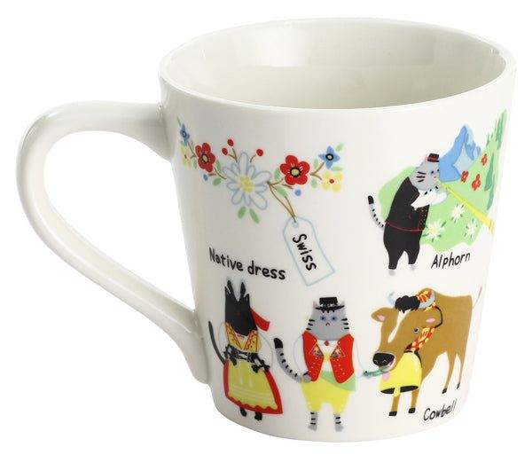 This is a cute mug depicting a national flag and a cat dressed up in a costume associated with the country and a cat enjoying an action.