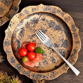A gold plate with an innovative design that inspires creativity on the part of the person serving it.