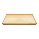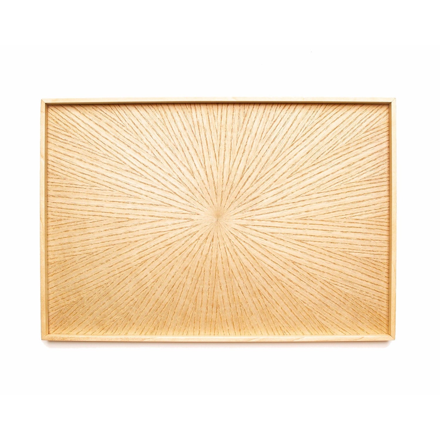 By laminating veneers cut at an acute angle around the center of the tray, the tray looks as if rays of light are coming from the center of the veneer.