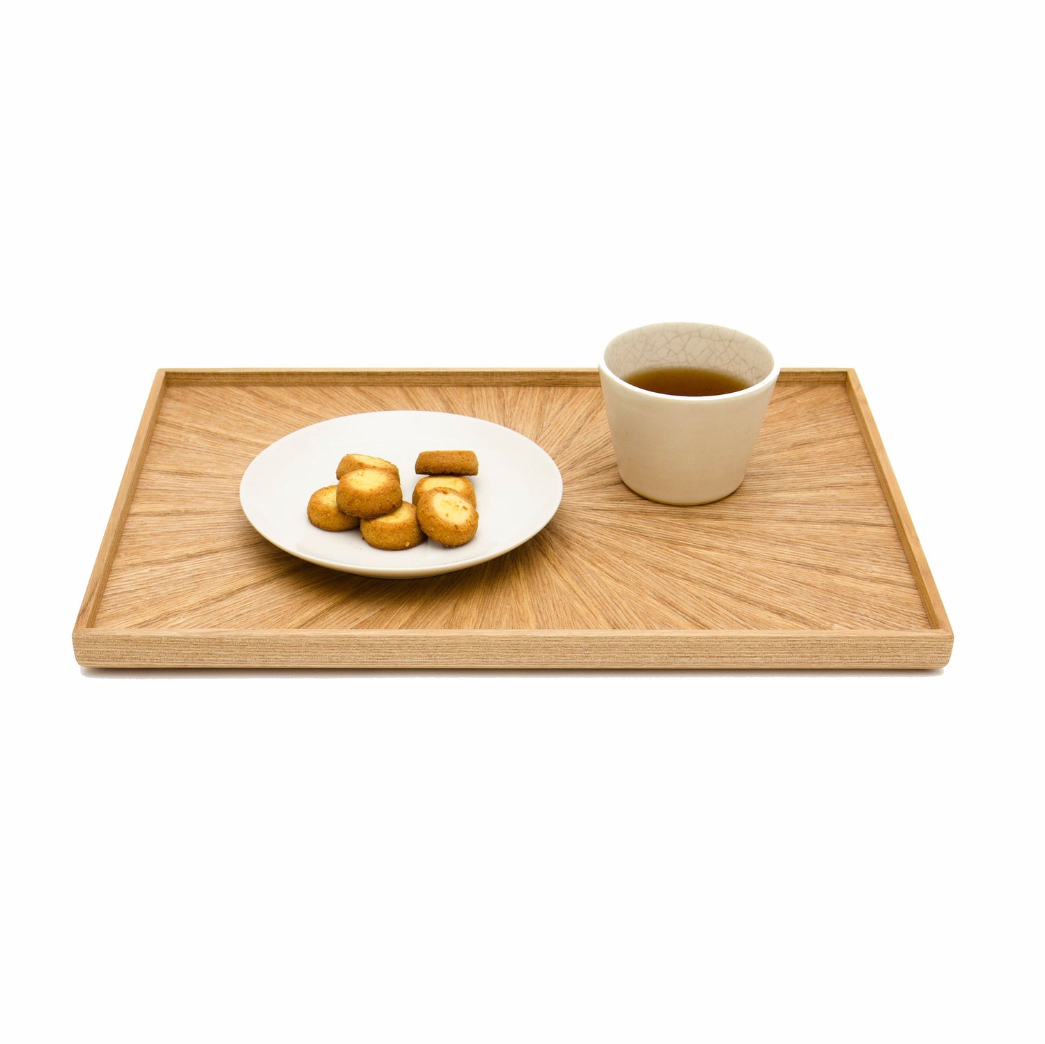 The Rays Tray is a product that takes advantage of the characteristics of the wood grain, which appears different colors depending on the angle of the light and the direction from which the tray is viewed.