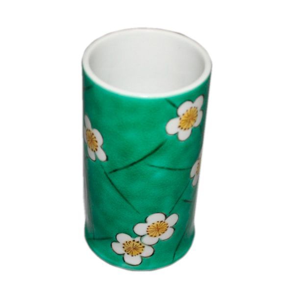 The Kutani nuri-shite ground is painted green with large ice cracks and white plum blossoms scattered on it. The classics come alive in a modern way.