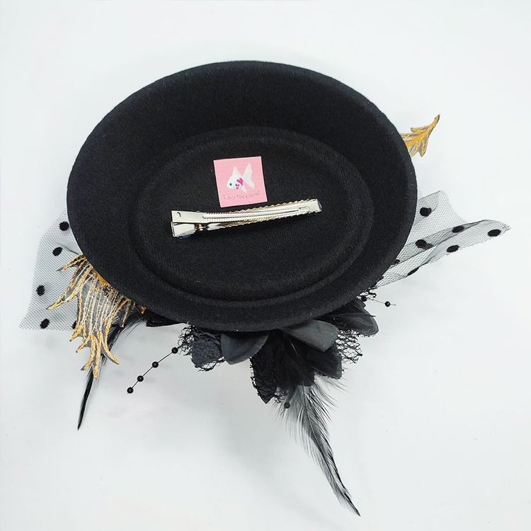 Black mini hat with gold flowers and peacock embroidered feather decorations.