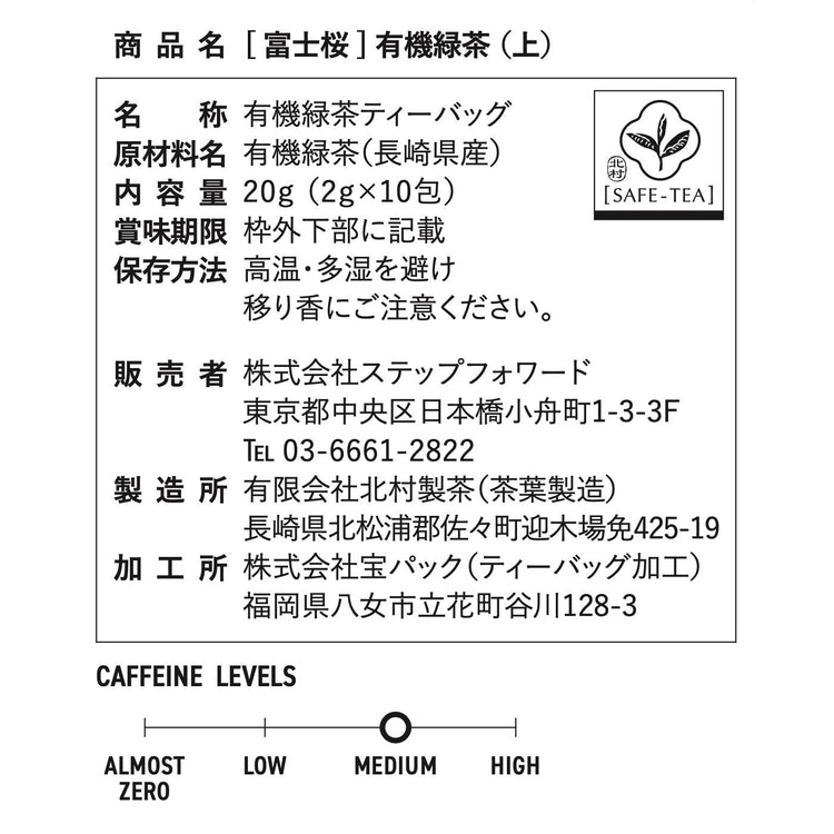 Fujizakura is made from organic tea leaves grown without the use of any pesticides. It is a domestic organic Japanese tea made from tea leaves of Kitamura Seicha, which has been certified as JAS organic in Japan and has passed the strict standards for residual pesticides by the international testing, inspection, and certification organization [SGS], and has received numerous awards including the Medal with Yellow Ribbon.