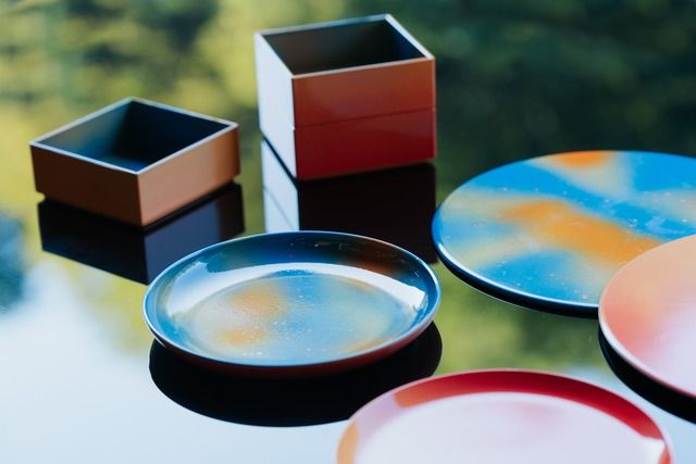 A plate that can be used to place small items with the characteristic variegated lacquer on the front.