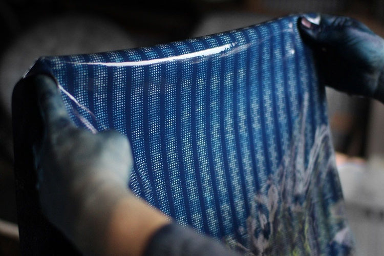 전통 방식을 고수하여, 일본 종이와 감물 타닌으로 정교하게 조각한 종이 무늬 위에 미강유와 찹쌀로 만든 풀을 발라 염색을 방지합니다.