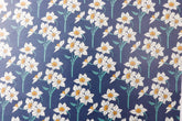 짙은 남색 바탕에 수선화의 은은한 흰색이 어우러져 차분하고 복고적인 분위기를 자아냅니다. 지나치게 화려하지 않은 디자인으로 어떤 자리에도 잘 어울려 다양한 용도로 활용 가능합니다.