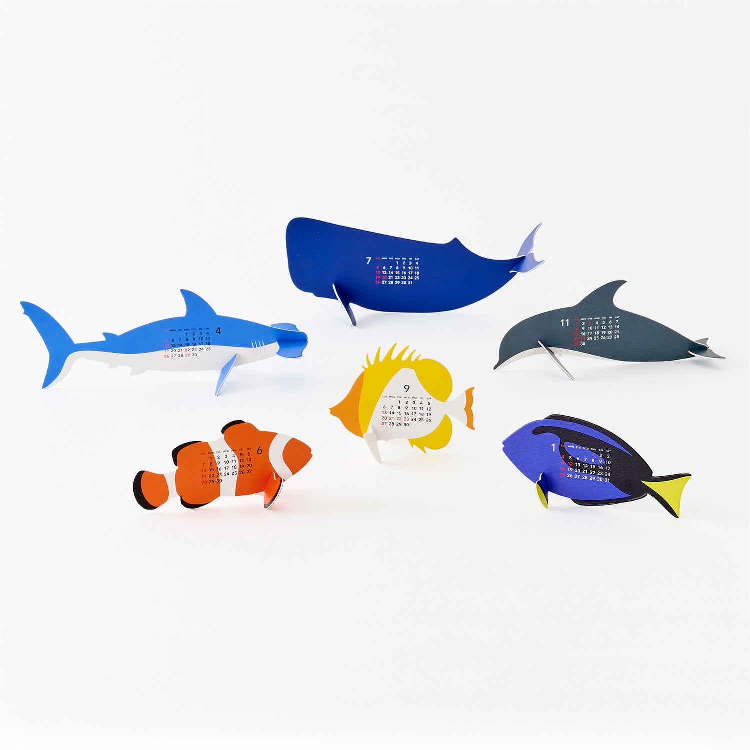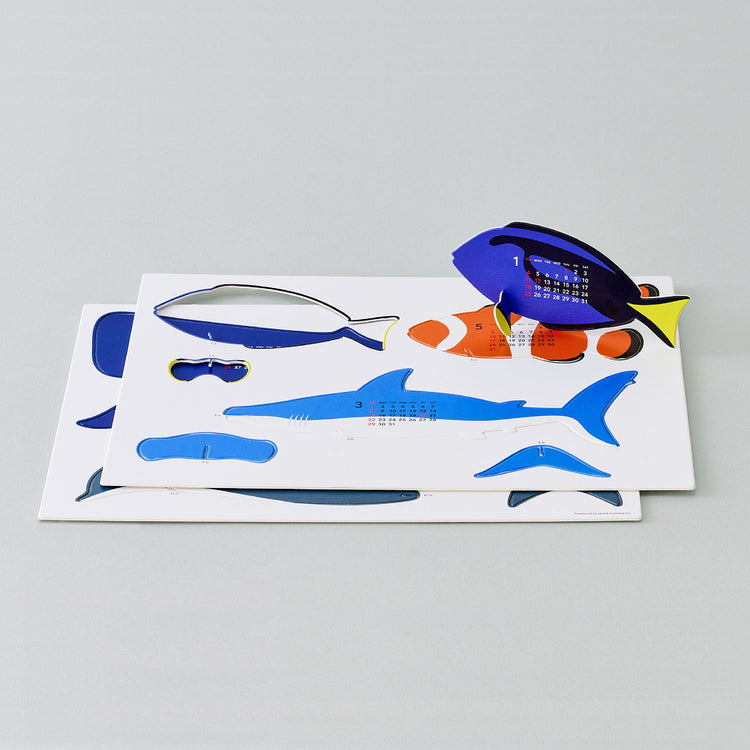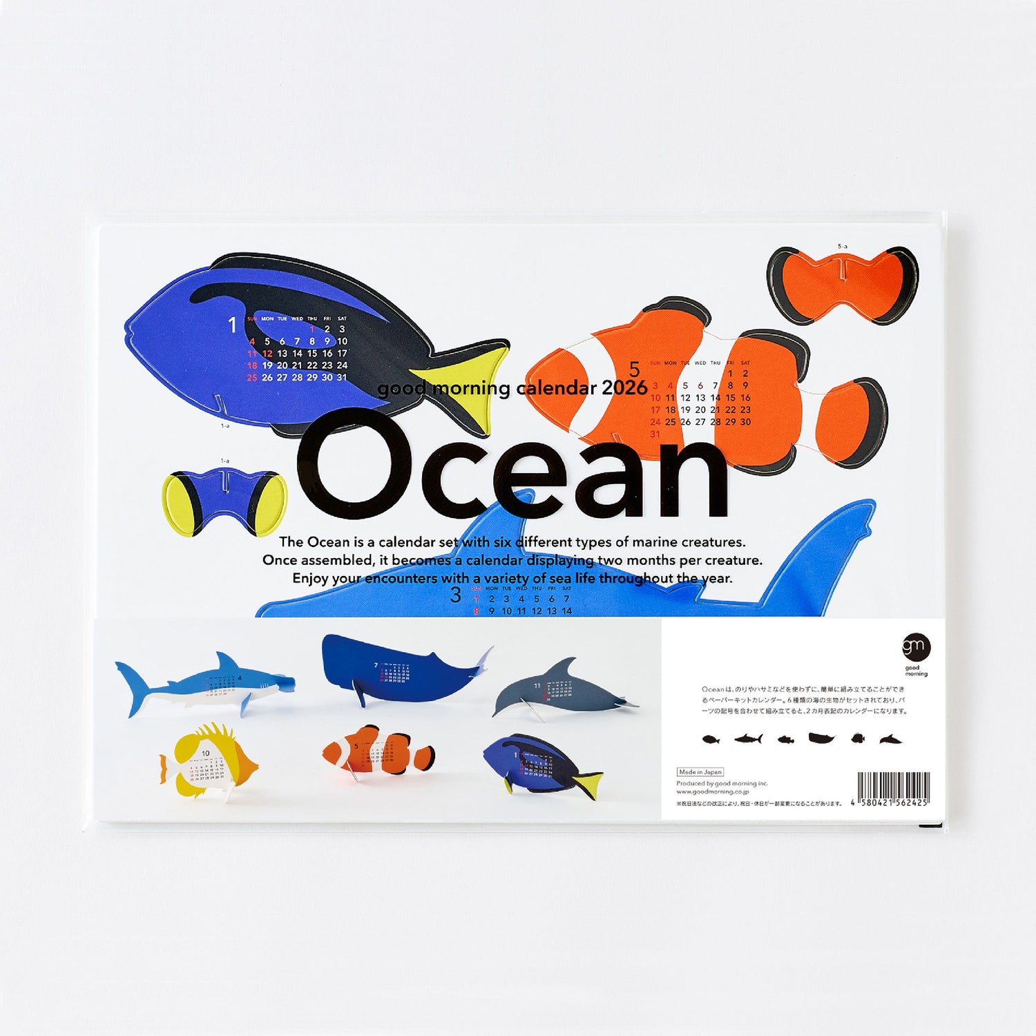 '오션'은 접착제나 가위 없이도 쉽게 조립할 수 있는 종이 키트 달력입니다. 세트에는 6종의 바다 생물이 포함되어 있으며, 부품에 있는 기호에 따라 조립하면 2개월 달력이 됩니다.