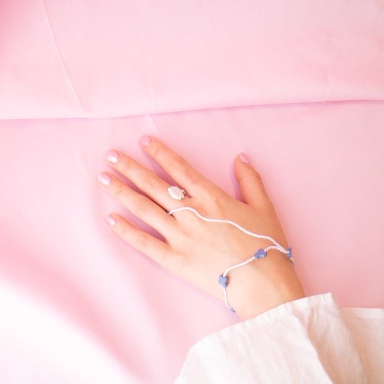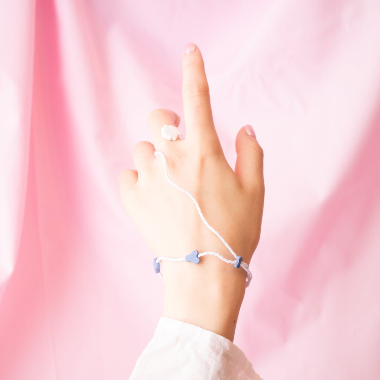 이 반지는 흰 클로버로 장식되어 있습니다. 팔찌로도 착용 가능하고 반지로도 착용 가능합니다.