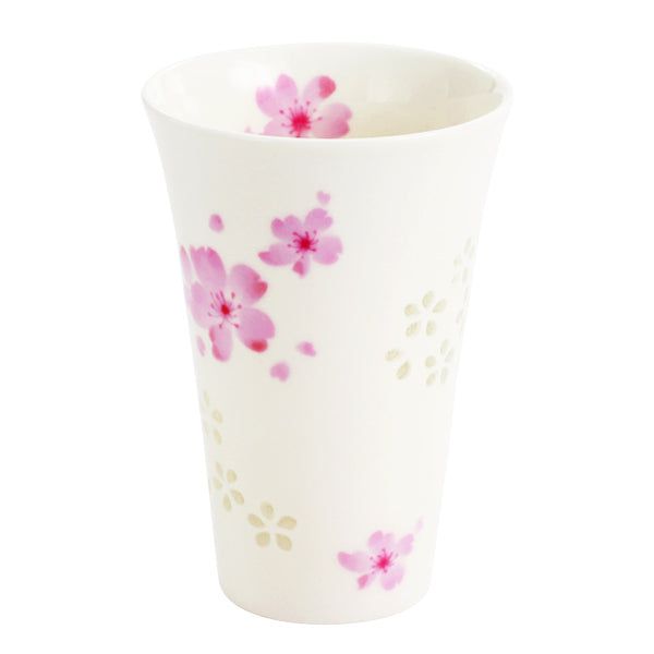 이 투각 무료 컵은 벚꽃 모양의 움푹 들어간 부분에 투명한 유약이 칠해져 있습니다.