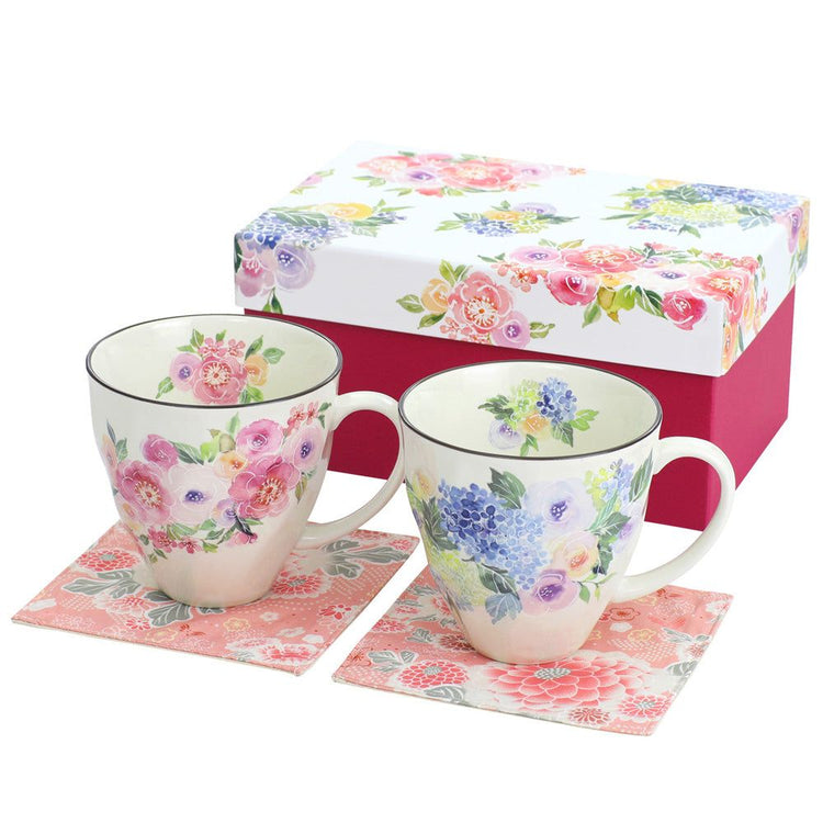 이 선물 세트에는 머그잔 한 쌍과 코스터가 포함되어 있습니다.