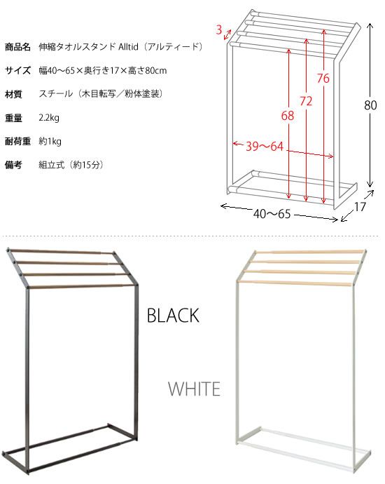 The stand with four bars can be easily extended or retracted from 40 to 65 cm in width according to the size of the bath towel to be hung.
