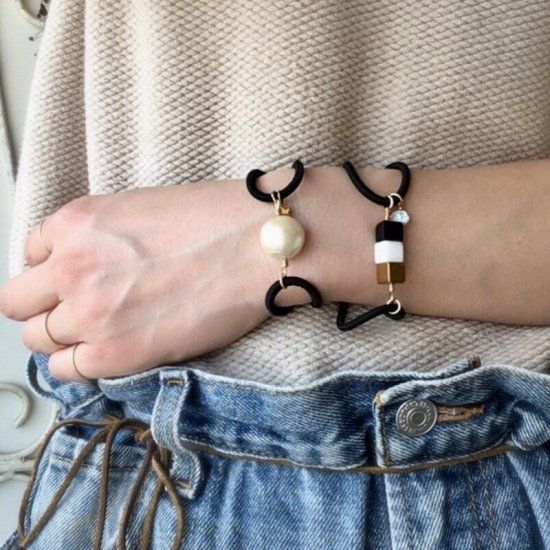 이 포니테일은 머리끈으로 착용하거나 팔에 장식으로 사용할 수 있습니다.
