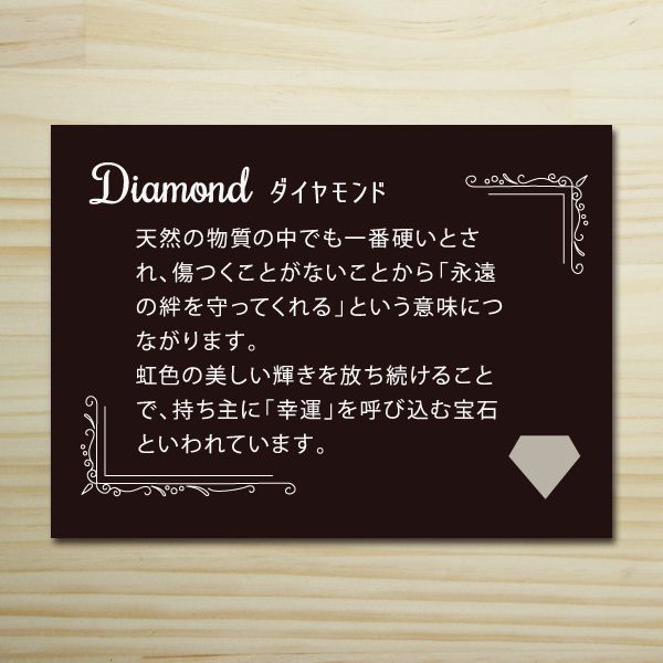다이아몬드는 모든 천연물질 중에서 가장 단단한 것으로 여겨지며, 손상되지 않기 때문에 "영원한 유대감의 수호자"라는 의미로 여겨집니다.