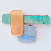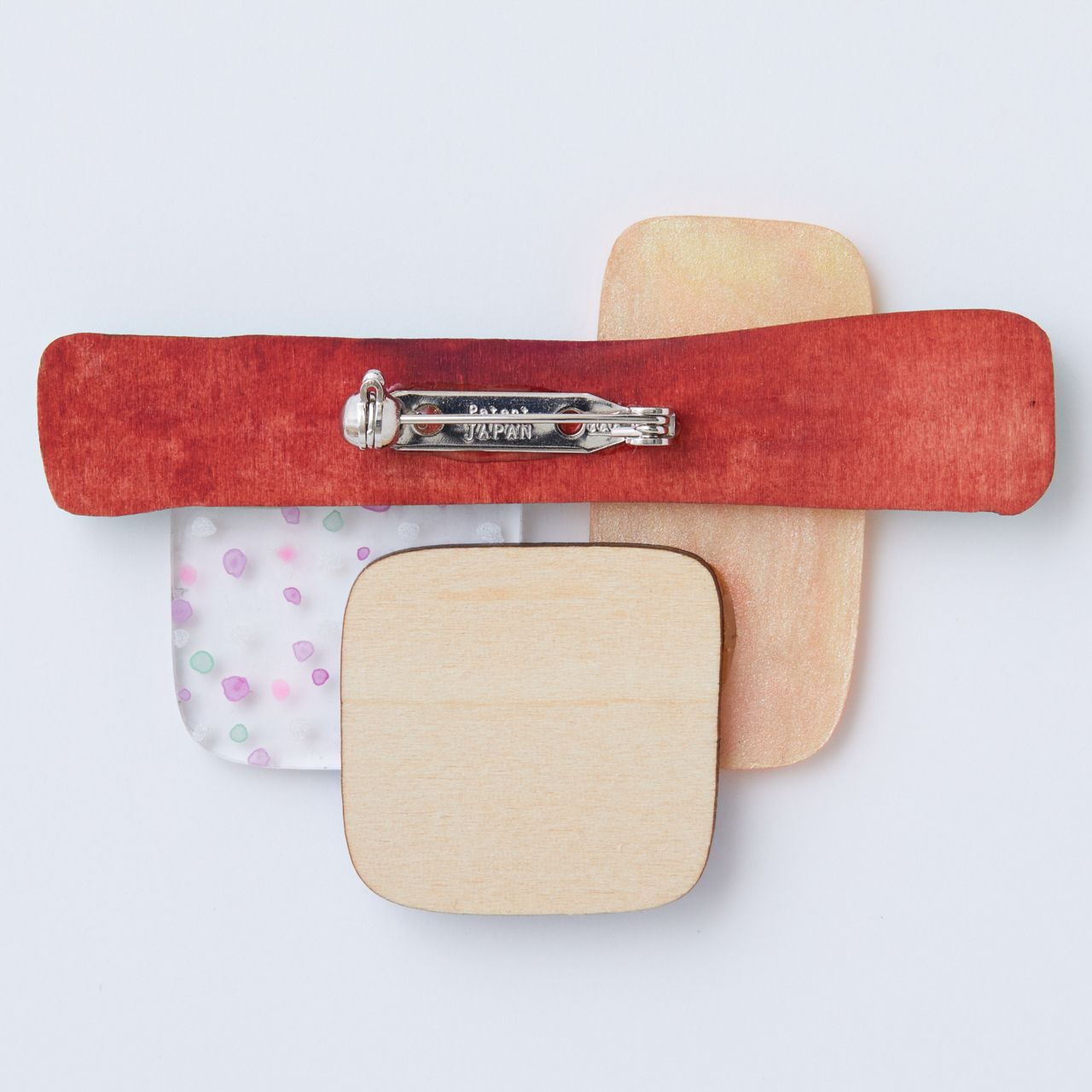 이 브로치는 칠해진 나무와 아크릴을 겹쳐 만든 예술 작품처럼 보입니다.