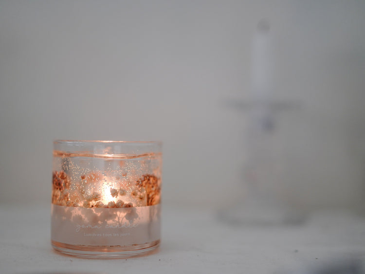 젤 왁스로 둘러싸인 작은 꽃이 있는 촛대입니다.