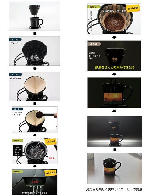일반적으로 드리퍼와 머그잔은 모두 검은색이지만, 끓는 물을 부으면 무늬가 나타나는데, 시각적으로 미뢰를 자극하는 보석과 같습니다.