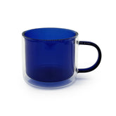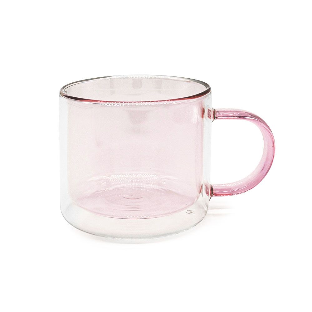 색상이 들어간 내부가 있는 세련된 이중 유리 컵입니다.