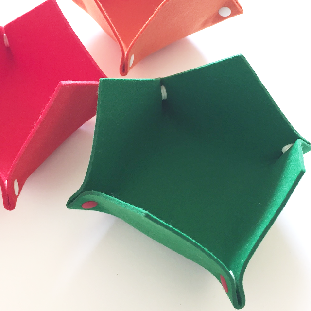 크리스마스 선물로 안성맞춤인 녹색과 빨간색 크리스마스 색상의 펠트 "액세서리 케이스"는 테이블 위에 활짝 핀 꽃을 모티브로 디자인되었습니다. 펠트의 탄력으로 자연스럽게 감도는 컬은 풍성한 볼륨감과 함께 작은 소품들을 더욱 스타일리시하게 장식해 줍니다.
