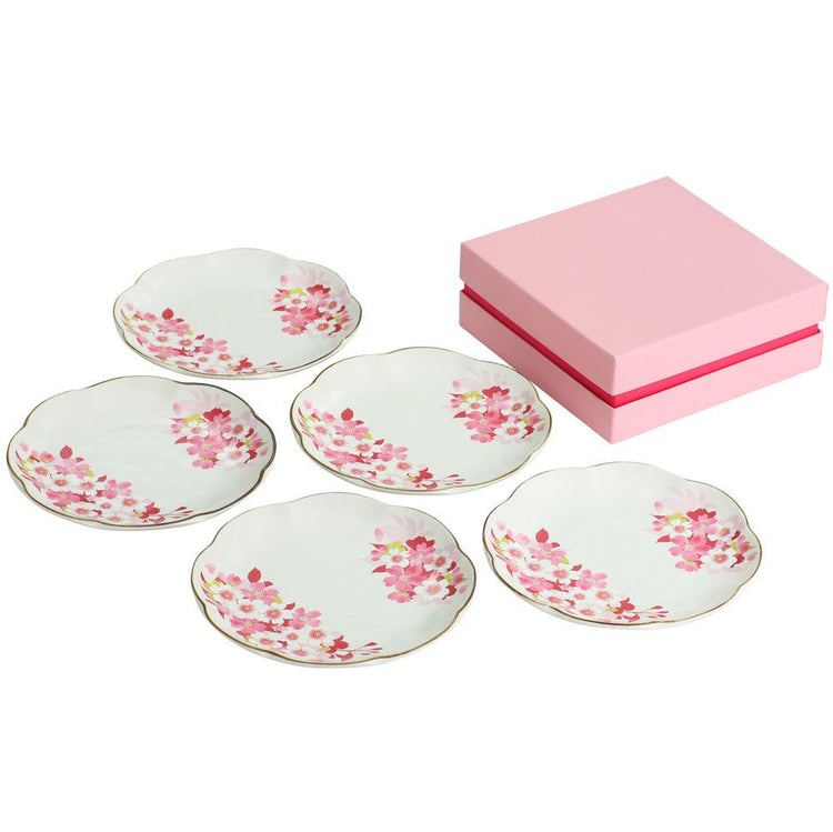 장식 상자에 꽃 모양 접시 5개가 들어 있는 선물 세트입니다.