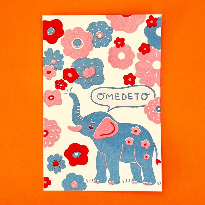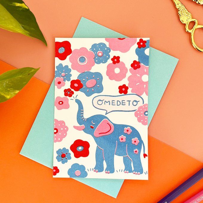 OMEDETO 카드, 봉투 세트 - 코끼리와 꽃