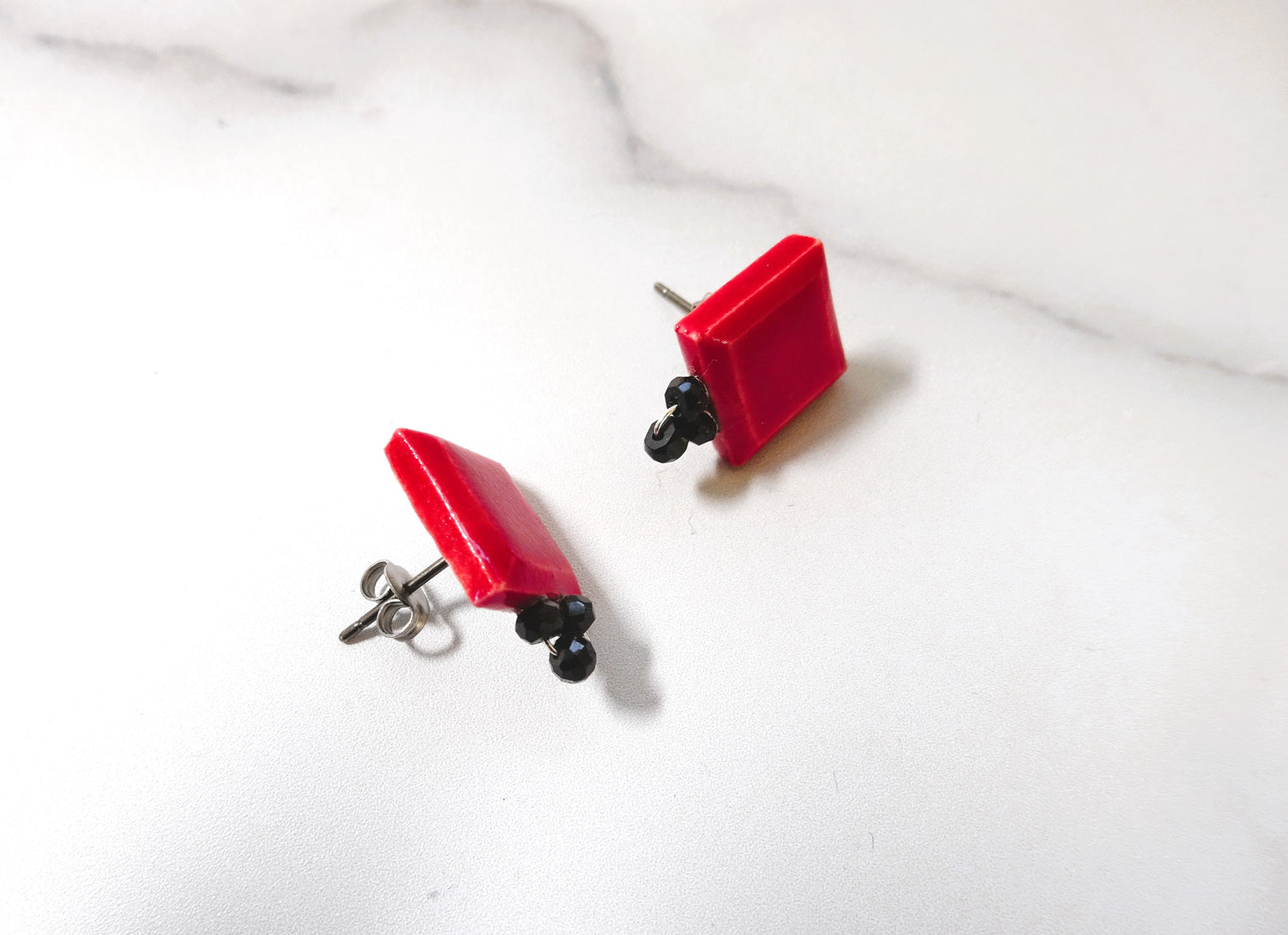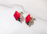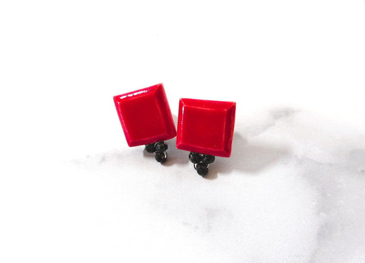 Pierced earrings with square and black spinel (red)