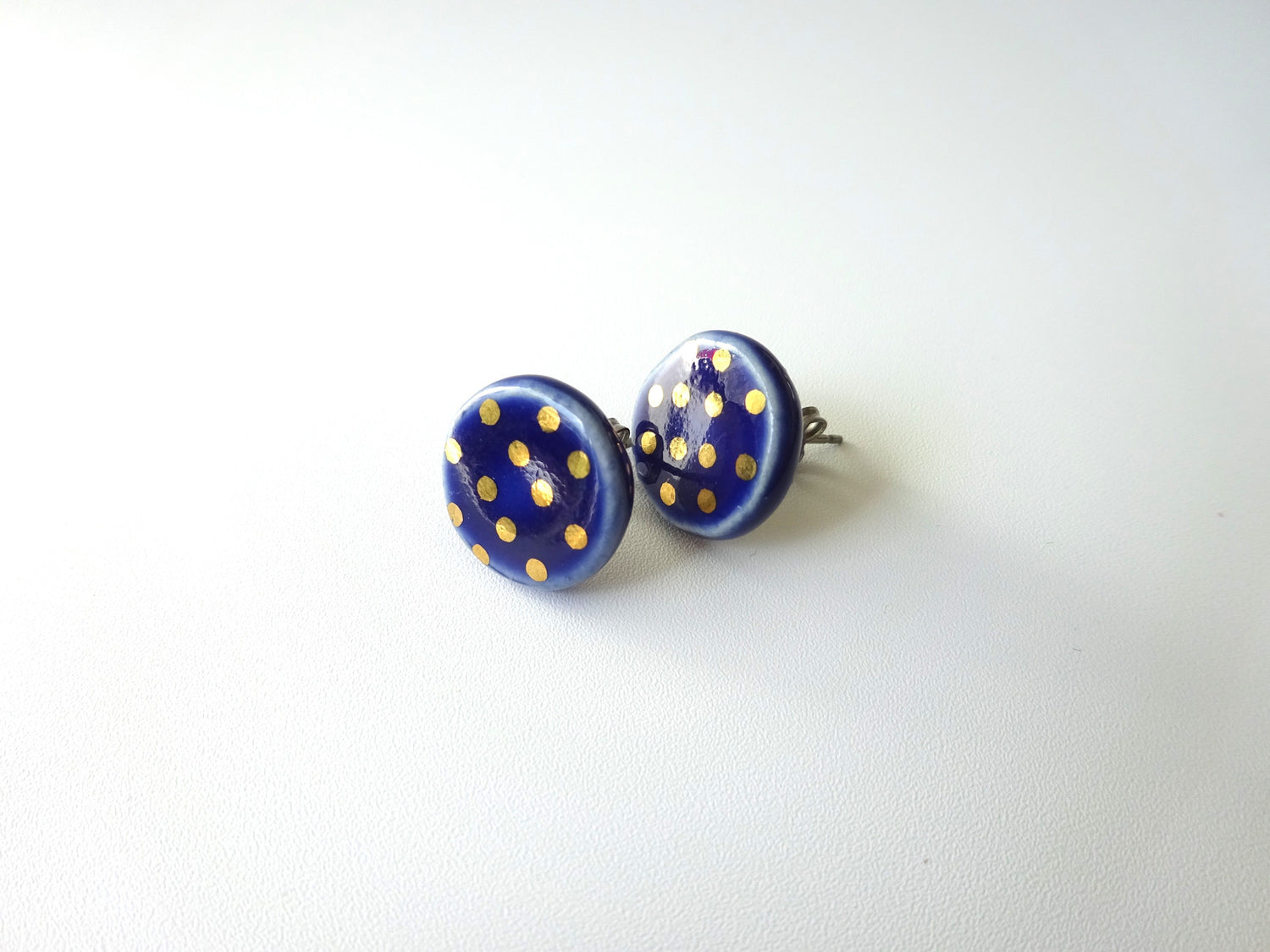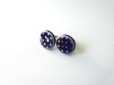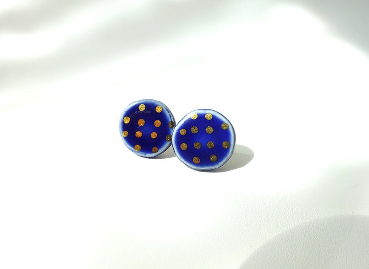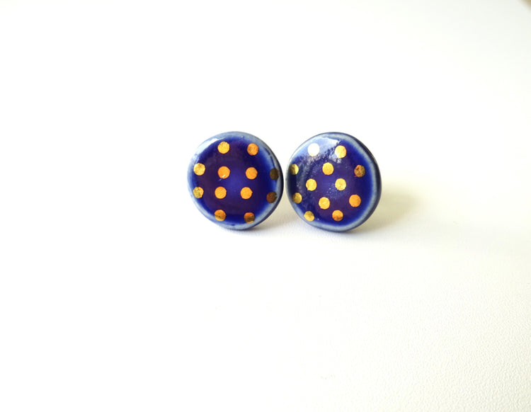 Pierced earrings/Clip-on earrings in gilt dot patterned pottery.