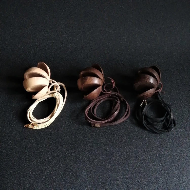 A small chord castanet that can be used as a bag charm, necklace, or accessory.