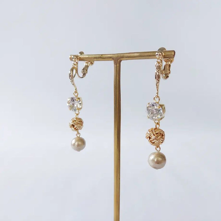 3 strands Pierced earrings with tamamusubi, crystal beads and cotton pearls