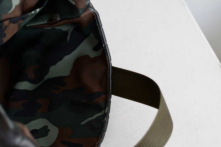 The inside fabric is camouflage-patterned nylon oxford. The handle is made of green nylon tape.