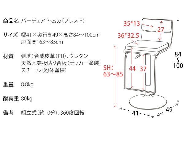 Size 41 (width) X 49 (depth) X 84 to 100 cm (height) (seat height: 63 to 85 cm)m