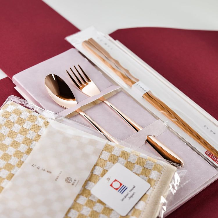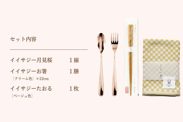 The combination of iisazy spoon and fork set (for one person), iisazy chopsticks (22cm), and iisazy towel (beige), which is moist and smooth and "comfortable".