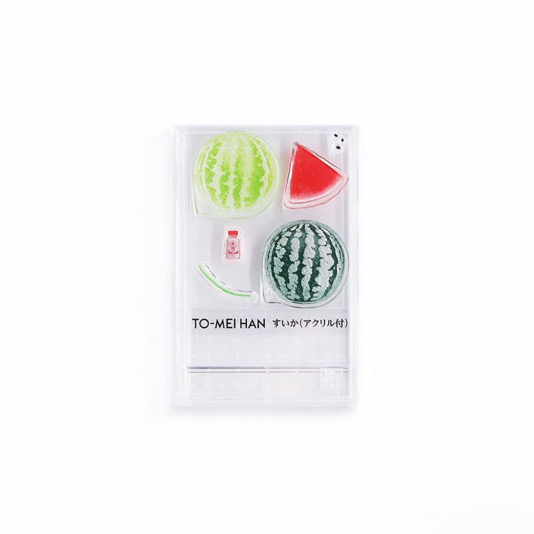 The set includes a 3-color multi-color stamp with orange and yellow outer skin and green leaves, and acrylic.