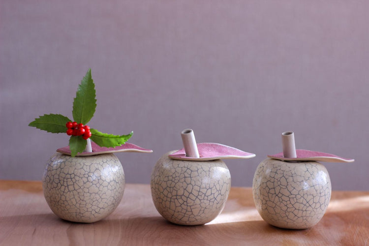 Add a playful touch to your decor with this apple-shaped vase. This vase features a lovely apple shape and is decorated with a blue crack pattern on a white background, creating a stylish atmosphere in any space. The separate leaves and branches can be freely arranged to create your own unique style. In addition, because they are handmade, each piece has its own unique texture and fine finish. The more you use it, the more its presence will increase and it will give warmth to your room. Please display your favorite flowers and enjoy a hearty interior with this vase.