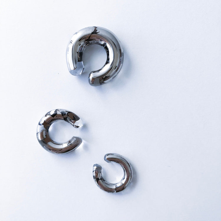 These ear cuffs are simple rings made of heat-resistant glass with platinum coloring baked onto them.